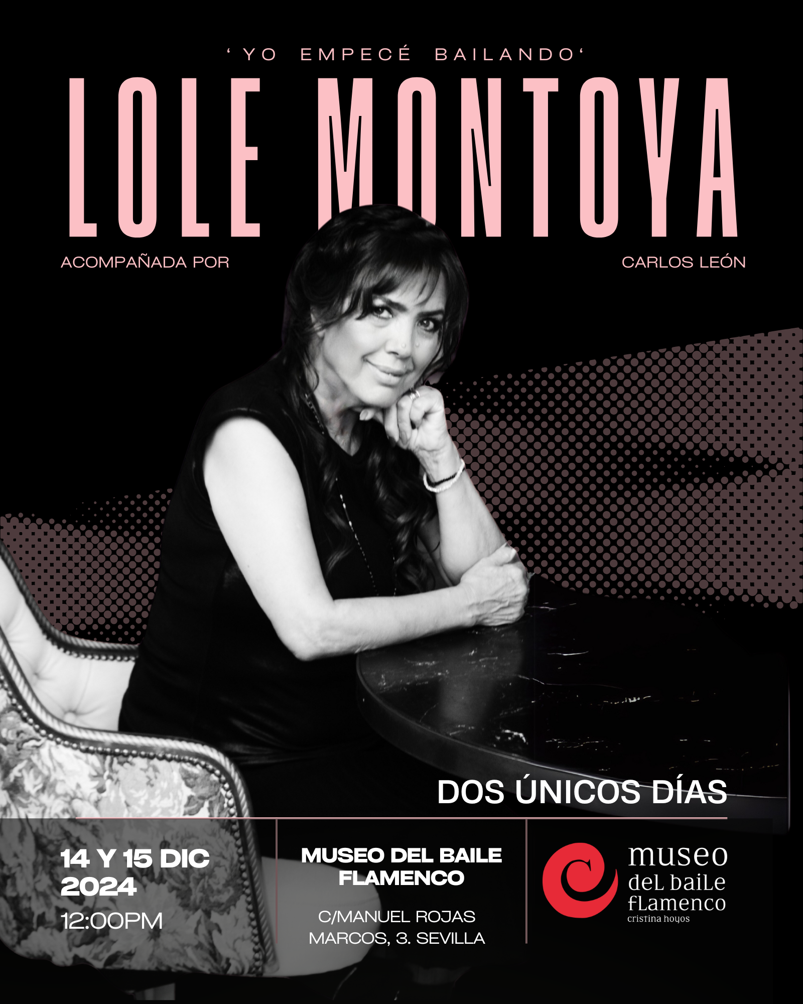 Lole Montoya vuelve a pisar el tablao. La cantaora sevillana dará dos únicos conciertos en el Museo del Baile Flamenco, los días 14 y 15 de diciembre a las 12:00h. En este lugar emblemático Lole Montoya rendirá homenaje a sus orígenes artísticos, recordando sus inicios como bailaora. La cantaora estará acompañada por el guitarrista Carlos León, en una puesta en escena íntima y cercana.
